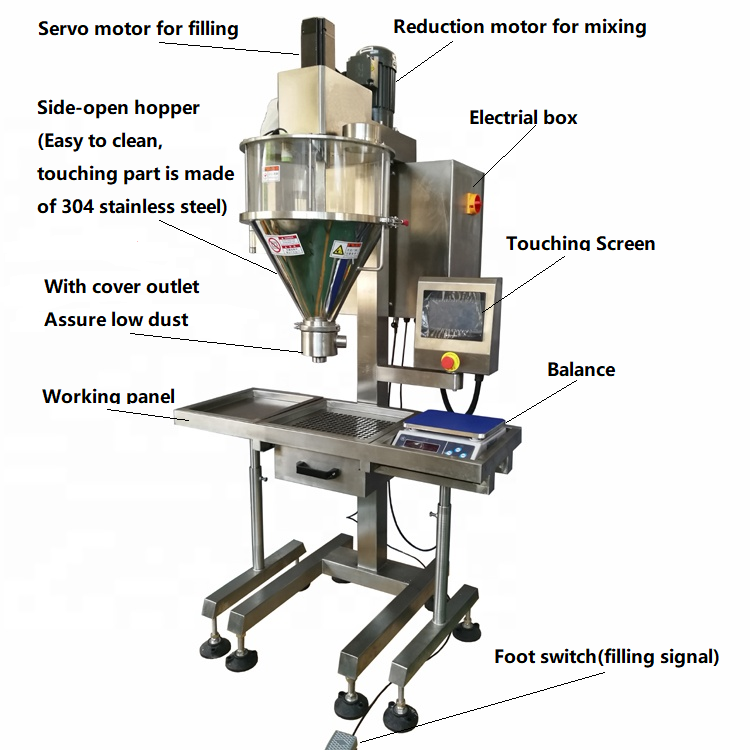 Semi automatic auger type powder filling machine is a compact model applied to dose all kinds of dry powder both free flow and non free flow powder into bags/bottles/cans/jars/etc. The filling was controlled by PLC and servo drive system featured with high speed and good accuracy.